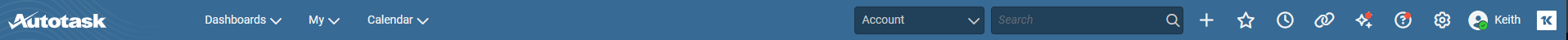Die Hauptsuche nach Autotask wird in der oberen Navigationsleiste angezeigt. Sie können eine große Anzahl von Feldern der Datenbank durchsuchen. Des Weiteren können Sie die Onlinehilfe, Ihre KnowledgeBase und die Datto Community durchsuchen.