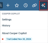 Klicken Sie auf dieses Symbol, um den Verlauf und die Einstellungen von Cooper Copilot anzuzeigen. Siehe Cooper Copilot Insights.