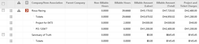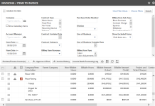 - Firmenzeilen: Firmenzeilen repräsentieren die Firmen, für die Rechnungspositionen zur Rechnungsstellung verfügbar sind, die Ihren Filterkriterien entsprechen.