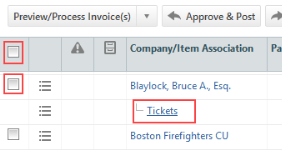 Die Gruppierungszeile nach Tickets (es gibt pro Firmenzeile immer nur eine) enthält alle Rechnungspositionen (Arbeitsaufwand, Warenposten, Spesen), die mit Tickets für die Firma aus der vorstehenden Zeile verbunden sind, sofern diese Rechnungspositionen nicht über Bestellnummern verfügen. Um das Dialogfeld „Ausgewählte Rechnungen verarbeiten“ für Posten in dieser Gruppierung zu öffnen, klicken Sie auf die Bezeichnung Tickets. |