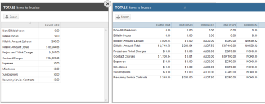 Wenn Multi-Währung aktiviert ist, werden in der Tabelle „Rechnungsstellung / Posten zur Rechnungsstellung“ alle Beträge in der Kundenwährung der jeweiligen Firma angezeigt. Für jede Währung werden Zwischensummen angezeigt, und die Endsumme wird in der internen Währung angezeigt. Sie können nach Währung filtern. Das Dropdown-Menü enthält alle aktiven Währungen sowie alle inaktiven Währungen, die mit einer Firma verbunden sind, die über Posten zur Rechnungsstellung verfügt. |