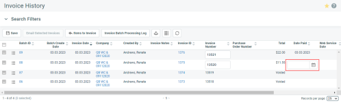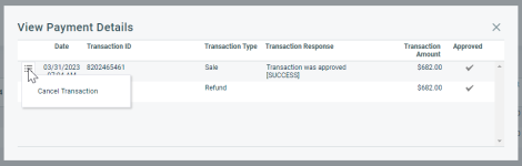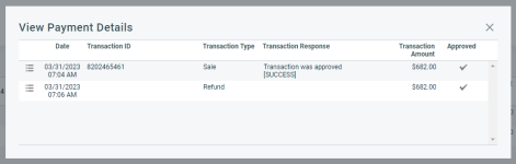 Wenn Sie stornieren, wird das Häkchen aus der Transaktion entfernt. Die Zahlung ist erfolgt (es gibt eine Transaktions-ID), jedoch sind der Kaufbetrag, der Erstattungsbetrag, der Nicht angewandte Betrag und der Angewandte Betrag alle auf 0,00 gesetzt. Das Datum der Bezahlung wird aus der zugehörigen Rechnung entfernt und die Rechnung wird in den Zustand vor der Verarbeitung der Zahlung zurückversetzt.