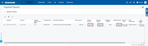 Wenn ein Kunde einen Rechnungsposten bestreitet und Sie die Rechnung, auf die die Zahlung angewendet wurde, stornieren, sind der Verkauf und die Zahlungstransaktion noch immer erfolgt, aber die Rechnung, auf die die Zahlung angewendet wurde, ist nicht mehr mit der Zahlung verbunden. Daher gibt es nun einen Nicht angewandten Betrag, der dem Kaufbetrag entspricht, und der Angewandte Betrag wird auf Null gesetzt.