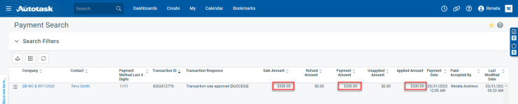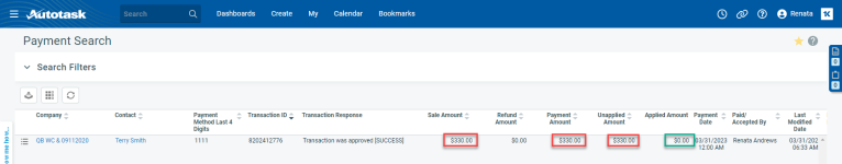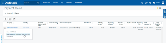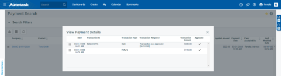 Es kann immer vorkommen, dass eine Transaktion nicht über das Payment Gateway abgewickelt werden kann: eine Kreditkarte ist gesperrt, ein Konto ist überzogen usw. Derzeit werden diese Informationen nicht mit Autotask synchronisiert. Um diese Zahlung zu entfernen, die nun nicht im Payment Gateway vorhanden ist, haben Sie die Möglichkeit, die Zahlung in Autotask zu stornieren.