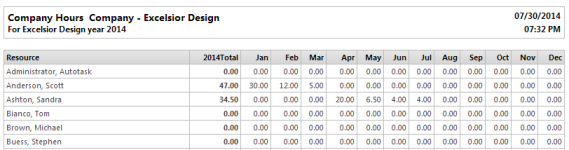 Gesamter Arbeitsaufwand für das ausgewählte Jahr nach Firma, nach Monat aufgeschlüsselt. |