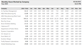 Abgerechnete Arbeitsstunden für ausgewählte Firmen nach Mitarbeiter und Monat mit Summen für das laufende Jahr. |