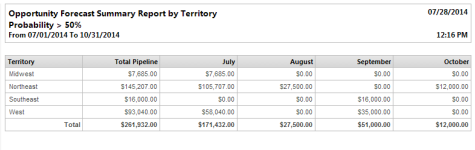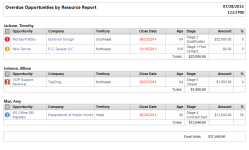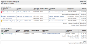 Dieser Bericht bietet die Möglichkeit, Details zu Verkaufschancen zu überprüfen. Es gibt mehrere Filtermöglichkeiten, z. B. nach Startdatum, Status, Verkaufsgebiet, Verkaufschancen-Betrag und -Verantwortlichem. Der Bericht ist nach Region und Verkaufschancen-Verantwortlichem sortiert. |
