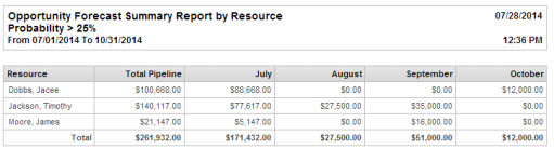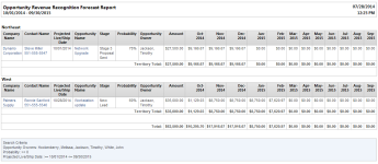 Umsatzrealisierungsprognose nach Monat, beginnend mit dem zugesagten Lieferdatum. Beachten Sie, dass das Feld Zugesagtes Lieferdatum Daten enthalten muss, damit die Verkaufschance in diesem Bericht erscheint. |