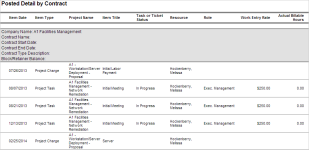 | Beschreibung | Dieser Bericht bietet Informationen über Posten, die im System gebucht wurden, mit Ansicht nach Vertrag. Die Informationen schließen Arbeiten an Aufgaben und Tickets, Projekt- und Ticketwarenposten sowie Meilensteine ein. Der Bericht bietet eine Zusammenfassung der Arbeit verglichen mit dem Vertrag. |