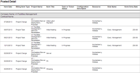 | Beschreibung | Dieser Bericht bietet Informationen über Posten, die im System gebucht wurden. Die Informationen beinhalten Arbeiten an Aufgaben und Tickets, Projekt- und Ticketwarenposten, Meilensteine, Spesen, Stundenkontingent-/Vorauszahlungskäufe, Ticketkäufe, Services und Ratenzahlungen. Der Bericht kann Rechnungen ergänzen, um detaillierte Informationen über die für einen Kunden geleistete Arbeit anzuzeigen. |