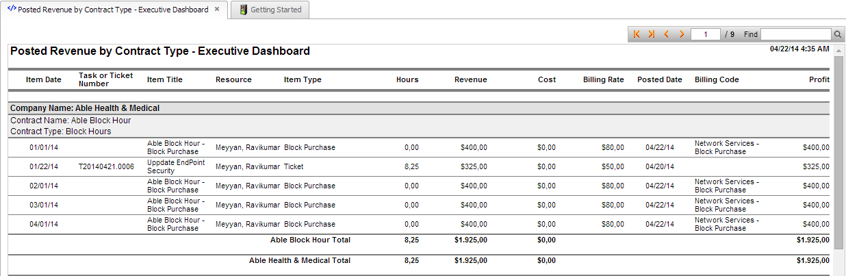 Dieser Bericht bietet eine detaillierte Einzelpostenansicht von Umsatz, Kosten und Gewinn, gruppiert nach Organisation, Vertrag und Service/Paket. |