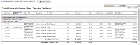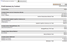 | Beschreibung | Detaillierte Umsatz-, Kosten- und Gewinninformationen nach Vertrag gruppiert. Daten können nach Buchungsdatum gefiltert werden. |
