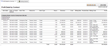 | Beschreibung | Gewinn- & Verlustdetails basierend auf der geleisteten Arbeit für Aufgaben/Tickets, die mit einem bestimmten Vertrag verbunden sind. Der Bericht bietet die Möglichkeit, Ergebnisse nach allen bisher oder in einem bestimmten Datumsbereich durchgeführten Arbeiten anzuzeigen. HINWEIS  Die Felder für das Arbeitsdatum sind erforderlich, selbst wenn nach „Bisheriger Vertrag“ gefiltert wird. Die Felder für das Arbeitsdatum bestimmen den Inhalt der Vertragsauswahl, in der alle Verträge mit Arbeitsdaten im angegebenen Zeitraum angezeigt werden. Wählen Sie „Bisheriger Vertrag“ aus, um alle Arbeitsaufwandsposten sowie Vertrags-/Projekt-/Ticketwarenposten für den gesamten Zeitraum des ausgewählten Vertrags zurückzugeben. Löschen Sie „Bisheriger Vertrag“, um lediglich Posten für den angegebenen Zeitraum auszuwählen.