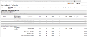 | Beschreibung | Dieser Bericht bietet eine detaillierte Einzelpostenansicht von Umsatz, Kosten und Gewinn, gruppiert nach Organisation, Vertrag und Service/Paket. |