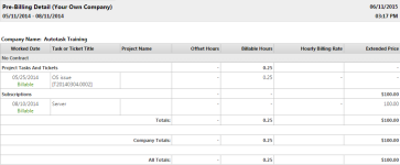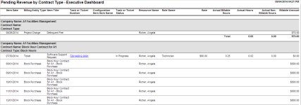 | Beschreibung | Dieser Bericht bietet Informationen über Posten, die darauf warten, im System gebucht zu werden, mit Ansicht nach Vertrag. Die Informationen schließen Arbeiten an Aufgaben und Tickets, Projekt- und Ticketwarenposten sowie Meilensteine ein. |