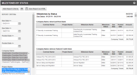 | Beschreibung | Eine Liste aller Meilensteine, die mit den Pauschalverträgen der ausgewählten Firma verbunden sind. Im Bericht werden auch das Fälligkeitsdatum und der Betrag aufgeführt. Kann nach Firma, Projekt und Meilensteinstatus gefiltert werden. |