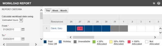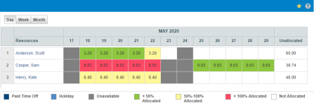 Wenn ein Mitarbeiter nicht verfügbar oder im Urlaub ist oder genehmigte Abwesenheit hat und für eine Aufgabe eingeplant ist, deren Dauer komplett in die nicht verfügbare Zeit fällt, wird die Aufgabe weiterhin im Auslastungsbericht angezeigt, allerdings ist ersichtlich, dass sie in einen nicht verfügbaren Zeitraum fällt. Der geschätzte Zeitaufwand wird in der Farbe schattiert, die anzeigt, dass dem Mitarbeiter > 100 % zugewiesen sind.