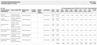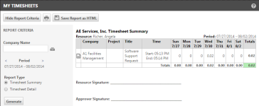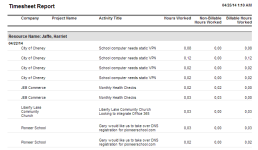 | Beschreibung | Dieser Bericht zeigt die geleisteten Arbeitsstunden an, so wie sie auf dem Stundenzettel eines Mitarbeiters erscheinen. Dies beinhaltet abrechenbare und nicht abrechenbare geleistete Arbeitsstunden nach Firma aufgelistet. |