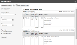 | Beschreibung | Dieser Bericht ist als Stundenzettel-Übersicht und als Stundenzettel-Detailbericht verfügbar. Die Übersicht zeigt die Zeiteinträge des Benutzers nach Zeiterfassungsperiode an. Der Stundenzettel-Detailbericht zeigt vom Benutzer eingetragene Zeiteinträge nach Firma sortiert für den ausgewählten Zeitraum an. Beide Berichte können nach Firma gefiltert werden. |
