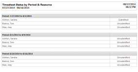 | Beschreibung | Zeigt nicht genehmigte Stundenzettel für die ausgewählten Zeiterfassungsperioden und Abteilungsmitarbeiter als eingereicht, nicht eingereicht oder storniert an. |