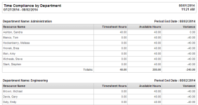| Beschreibung | Vergleich der Gesamtstunden mit den verfügbaren Stunden für alle Mitarbeiter, bei denen Sie ein Zeiterfassungsgenehmiger sind, (nach Abteilung) für die ausgewählte Zeiterfassungsperiode. Beachten Sie, dass Mitarbeiter, die keine Stundenzettel einreichen müssen, nicht beinhaltet sind. |