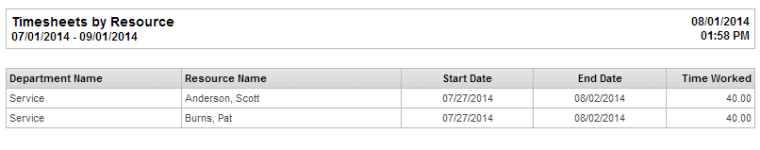 | Beschreibung | Übersicht über die geleistete Arbeitszeit (wie auf eingereichten Stundenzetteln erfasst) eines oder mehrerer Mitarbeiter in einer ausgewählten Abteilung für einen angegebenen Zeitraum. |