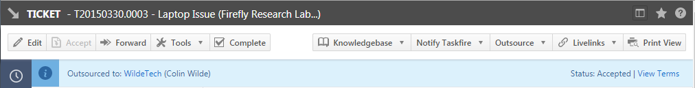 HINWEIS Wenn Ihre Firma Ticketwarnungen oder Taskfire verwendet, sehen Sie eventuell auch eine gelbe und/oder grüne Informationsleiste am oberen Rand des Tickets. Dies ist nicht auf die Outsourcing-Informationen bezogen. Siehe Tickets hinzufügen, kopieren und bearbeiten und Übersicht über internen Helpdesk für Kundenportal und Taskfire.