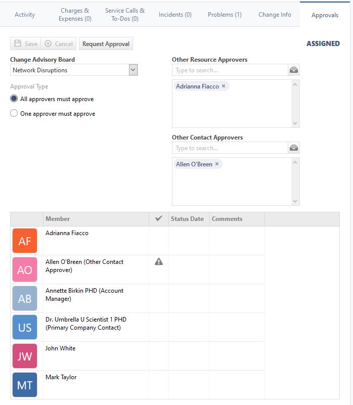 - Klicken Sie auf dem Change Request-Ticket auf die Registerkarte Genehmigungen. Zunächst ist der Genehmigungsstatus auf Nicht zugewiesen gesetzt.