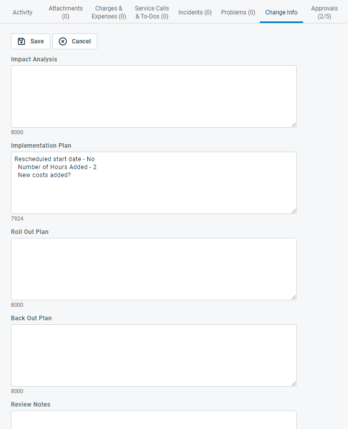Die Registerkarte Change-Informationen erscheint lediglich bei Change Request-Tickets. Sie enthält bis zu fünf Change-Informationsfelder, in denen Sie dokumentieren können, wie Sie den gewünschten Change verwalten werden. Der Change selbst sollte im Feld Beschreibung dokumentiert werden.