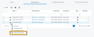 Die Seiten Anhangsverlauf, Notizverlauf und Zeiteintragsverlauf enthalten eine Aufzeichnung aller Aktivitäten, die an dem Element seit der Freigabe der Funktion ausgeführt wurden. Um die Seite zu öffnen, nutzen Sie den/die Pfad(e) im vorstehenden Abschnitt Sicherheit und Navigation.