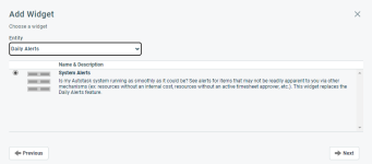 - Verwenden Sie die Filter, um auszuwählen, welche täglichen Meldungen angezeigt werden sollen. Filterdefinitionen und vollständige Details über alle Abschnitte des Fensters „Widget hinzufügen“ finden Sie unter Ein neues Widget hinzufügen.