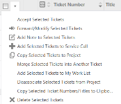 : Bietet Zugriff auf mehrere Handlungen, die Sie für jeden Eintrag in der Liste vornehmen können. Verfügbare Handlungen für Tickets können zum Beispiel das Öffnen der Ticketdetailansicht oder Bearbeitungsseite, das Weiterleiten/Ändern oder Kopieren des Tickets oder das Hinzufügen eines Zeiteintrags enthalten.