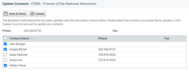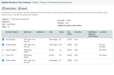 Nachdem Sie Änderungen an der Firmenadresse oder der Telefonnummer vorgenommen haben und auf Speichern klicken, wird die Seite „Firmenkontakte aktualisieren“ geöffnet, auf der alle zugeordneten Kontakte aufgeführt sind.