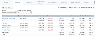 Die Tabelle „Rentabilität nach Vertrag“ zeigt Ihnen Umsatz, Kosten, Gewinn und Rentabilität für jeden Vertrag dieser Firma an, so dass Sie nicht nur sehen können, wie rentabel jeder Vertrag ist, sondern auch, wie viel Umsatz Sie erzielen und die Höhe der Kosten, die Ihnen für jeden Vertrag anfallen. Einen Überblick über den Inhalt finden Sie in Abschnitt Umsatz- und Kostenpositionen auf Firmen-, Vertrags- und Projektebene.