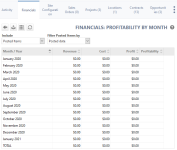 Die Tabelle „Rentabilität nach Monat“ zeigt Umsatz, Kosten, Gewinn und Rentabilität für die Firma in den letzten 12 Monaten (ohne den aktuellen Monat) an. Es ist beabsichtigt, eine historische Entwicklung für diese finanziellen Metriken darzustellen. Um die Seite zu öffnen, nutzen Sie den/die Pfad(e) im vorstehenden Abschnitt Sicherheit und Navigation.