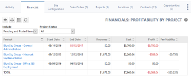 Die Tabelle „Rentabilität nach Projekt“ zeigt Ihnen Umsatz, Kosten, Gewinn und Rentabilität für jedes Projekt dieser Firma an, so dass Sie nicht nur sehen können, wie profitabel jedes Projekt ist, sondern auch, wie viel Umsatz Sie erzielen und die Kosten, die Ihnen für jedes Projekt anfallen. Um die Seite zu öffnen, nutzen Sie den/die Pfad(e) im vorstehenden Abschnitt Sicherheit und Navigation.