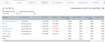 Die Tabelle „Gewinn nach Vertrag“ zeigt den Gewinn aller Umsätze und Warenposten des Vertrags für den aktuellen Monat und im bisherigen Jahresverlauf an und vergleicht diese Zahlen mit den gleichen Zeiträumen des Vorjahres, um eine historische Dimension zu den aktuellen Zahlen zu bieten. Einen Überblick über den Inhalt finden Sie in Abschnitt Umsatz- und Kostenpositionen auf Firmen-, Vertrags- und Projektebene.