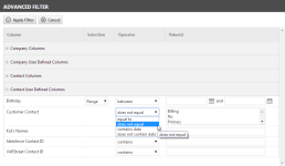 Mit dem erweiterten Filter auf den Seiten Kontaktgruppendetail und Kontakt zur Gruppe hinzufügen können Sie nach allen zur Anzeige verfügbaren Spalten filtern, ohne die Spalten in die Tabelle zu verschieben. Sie können auch nach zusätzlichen Spalten filtern, die nicht für die Anzeige in der Tabelle verfügbar sind, einschließlich Organisations- und Kontakt-UDFs.