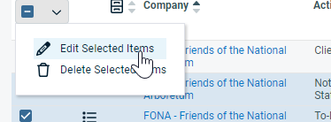 - Wählen Sie in Aufgaben- und Notiztabellen mit einem Kontextmenü mehrere Aufgaben oder Notizen aus (indem Sie die Kästchen auf der linken Seite markieren), klicken Sie dann auf das Dropdown-Symbol in der Auswahlspalte und wählen Sie Ausgewählte Elemente bearbeiten.