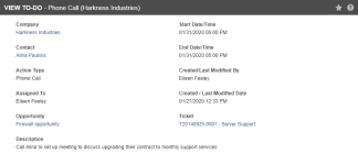 Die Firma, der das To-Do zugewiesen ist. Dies erscheint als schreibgeschützter Text oder (wenn Sie entsprechende Ansichtsberechtigungen haben) als ein Link. |