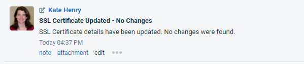 Wenn das Tracking für Domains und SSL-Zertifikate aktiviert ist, werden Domains und SSL-Zertifikate regelmäßig überprüft. Darüber hinaus können Sie den Auto-Update-Dienst auch manuell initiieren. Bei jeder Prüfung wird eine Systemnotiz generiert.