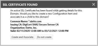 - Wenn ein SSL-Zertifikat für die Domain gefunden wird, werden Sie gefragt, ob automatisch ein Gerät dafür erstellt werden soll und dieses als untergeordnetes Gerät der neu erstellten Domain hinzugefügt werden soll.
