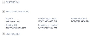 | Registrar | Der Registrar für den Domain-Namen ist ein Unternehmen, das sich um die Reservierung von Internet-Domain-Namen sowie um die Zuweisung von IP-Adressen für diese Domain-Namen kümmert. Wenn das Tracking für Domains und SSL-Zertifikate aktiviert ist und ein Wert empfangen wurde, wird er hier angezeigt. Andernfalls ist das Feld leer.
