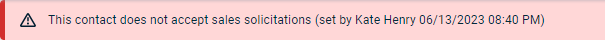 Wenn der Kontakt (oder der mit der Verkaufschance bzw. dem To-Do verbundene Kontakt, den Sie sich anzeigen lassen oder bearbeiten) keine Verkaufsangebote erhalten möchte, sehen Sie eine rosafarbene Leiste oben auf der Seite. Diese Leiste erscheint auf einer Verkaufschance, wenn der zugehörige Kontakt keine Verkaufsangebote erhalten möchte (selbst wenn das Kontaktfeld durch die Verkaufschancenrubrik ausgeblendet wird).