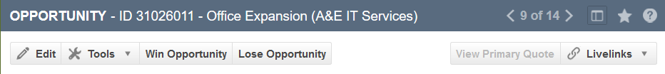 LiveLinks | Klicken Sie darauf, um ein Menü mit allen LiveLinks für Verkaufschancen zu öffnen, die für den Benutzer veröffentlicht sind. Klicken Sie auf einen LiveLink, um diesen aufzurufen. Siehe LiveLinks. |