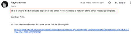 Wenn der Kunde das Feld Kommentare auf der Seite Angebot genehmigen/ablehnen ausfüllt, wird dieser Text verwendet, um eine Notiz in der zugehörigen Verkaufschance zu erstellen, wobei eine PDF-Version des Angebots als Anhang darunter hinzugefügt wird.![]()