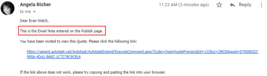 E-Mail-NotizenDieses Feld erscheint auf den Seiten Angebotseinstellungen und Angebot > Veröffentlichen. Damit können Sie individuelle Kommentare oder zusätzliche firmenbezogene Informationen zu einer E-Mail-Nachricht für ein Angebot hinzuzufügen, wenn Sie eine Vorlage für die E-Mail-Nachricht verwenden. Der Inhalt des Felds E-Mail-Notizen bietet außerdem den Inhalt für die Variable [Angebot: E-Mail-Notizen]. |