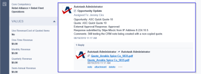 - Wenn die Kundenwährung und die interne Währung das gleiche Symbol verwenden (z. B. US- und kanadische Dollar), werden überall sonst in Autotask kanadische Dollar (die Kundenwährung) mit „CAD“ als Währungsindikator angezeigt, während US-Dollar das $-Zeichen nutzen. In der Angebotsvorschau wird jedoch das Währungsformat verwendet, das in der Angebotsvorlage eingerichtet ist.