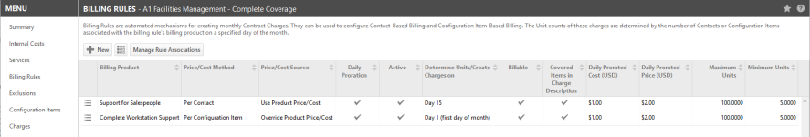 Sie können auf vertragliche Abrechnungsregeln zugreifen, indem Sie im Vertragsmenü auf den Link Abrechnungsregeln klicken. In einem Raster werden alle Abrechnungsregeln aufgelistet, die für diesen Vertrag erstellt wurden.