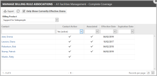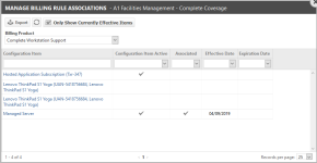 | Zuweisungen anzeigen/verwalten | Öffnet dasselbe Dialogfenster wie die Schaltfläche Regelzuweisungen verwalten; allerdings ist der Abrechnungsartikel der ausgewählten Abrechnungsregel im Dropdown-Menü enthalten. Siehe Hinzufügen von Kontakten und Geräten zu einer Abrechnungsregel. |